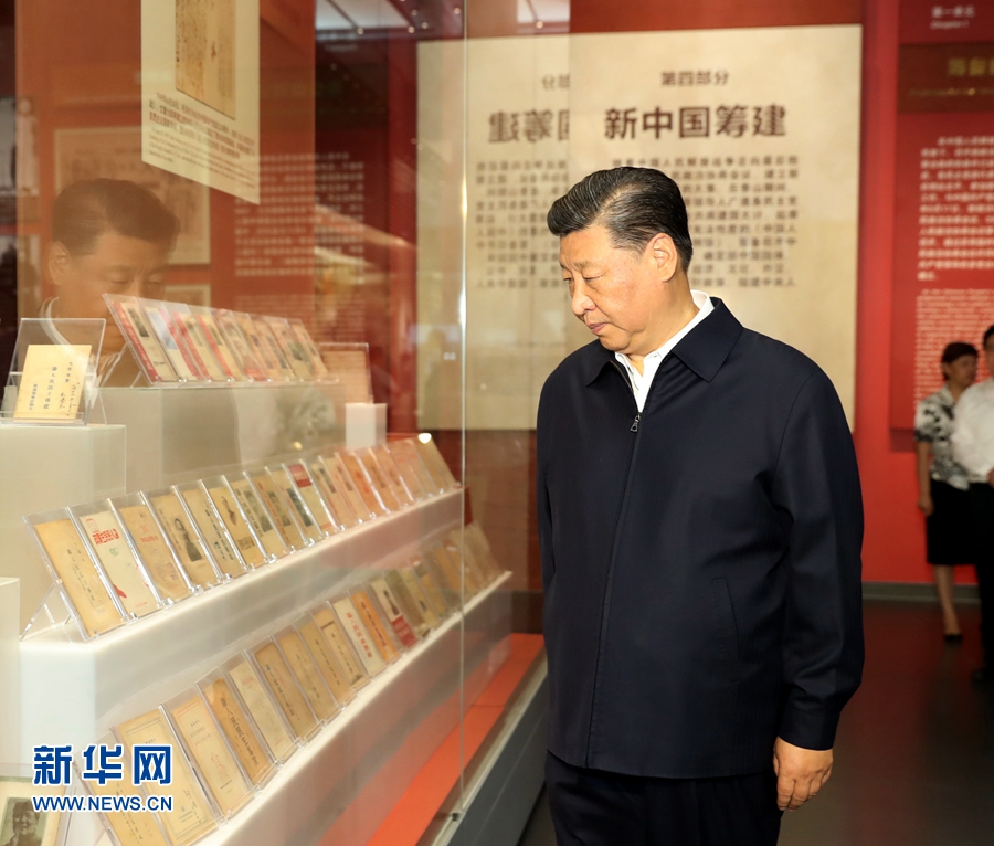 9月12日,中共中央總書(shū)記、國(guó)家主席、中央軍委主席習(xí)近平視察中共中央北京香山革命紀(jì)念地。這是習(xí)近平在香山革命紀(jì)念館參觀(guān)《為新中國(guó)奠基》主題展覽。 新華社記者 黃敬文 攝