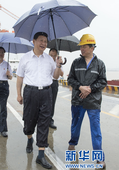 2013年7月,習(xí)近平來到武漢考察,一下飛機就冒雨來到武漢新港陽邏集裝箱港區(qū)。