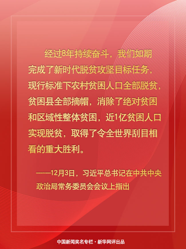 中共中央政治局常務(wù)委員會(huì)12月3日召開會(huì)議,聽取脫貧攻堅(jiān)總結(jié)評估匯報(bào)。習(xí)近平總書記在會(huì)上指出,經(jīng)過8年持續(xù)奮斗,我們?nèi)缙谕瓿闪诵聲r(shí)代脫貧攻堅(jiān)目標(biāo)任務(wù),現(xiàn)行標(biāo)準(zhǔn)下農(nóng)村貧困人口全部脫貧,貧困縣全部摘帽,消除了絕對貧困和區(qū)域性整體貧困,近1億貧困人口實(shí)現(xiàn)脫貧,取得了令全世界刮目相看的重大勝利。