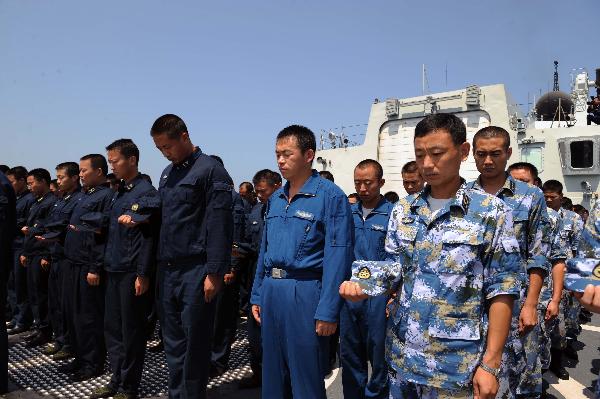 中國海軍護(hù)航編隊舉行默哀儀式悼念舟曲特大山洪泥石流遇難同胞