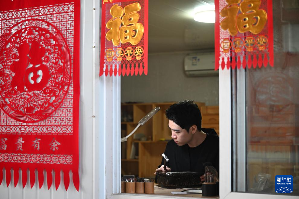 马赛在工作室内錾刻(3月7日摄)。