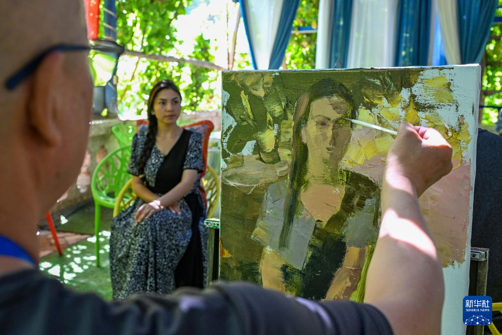 7月6日,在新疆克州阿图什市松他克镇阿孜汗村,小分队文化志愿者创作后与模特交流。