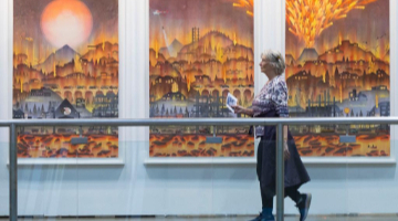 11月16日,观众在保利美高梅博物馆参观展出的云锦《丝路华章》卷轴。