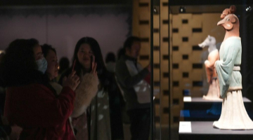 几名游客在甘肃省张掖市甘州区甘州府城景区内的冰雕展区内参观即将完工的冰雕作品(1月21日摄)。