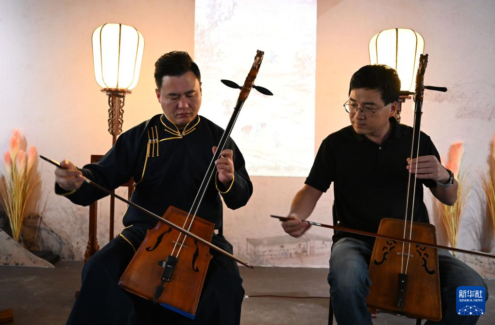 11月29日,观众在展览现场体验马头琴演奏。