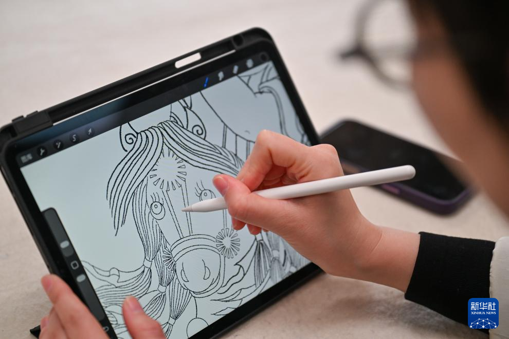 2月4日,在天津杨柳青画社,天津杨柳青画社第四代彩绘传承人王艳绘制马年主题年画底稿。