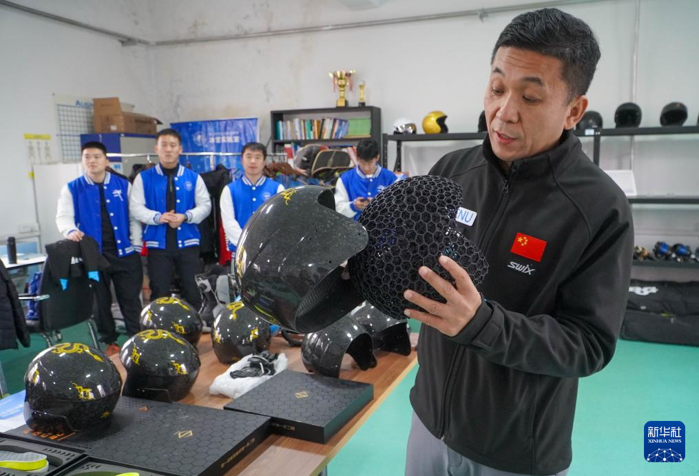吉林省冰雪运动重点实验室主任刘俊一展示实验室自主研发的3D打印定制化头盔(2024年11月14日摄)。新华社记者 颜麟蕴 摄