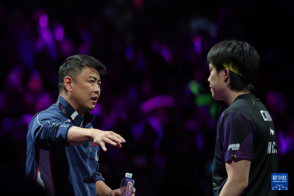 3月12日,教练王皓(左)在比赛间隙指导王楚钦。