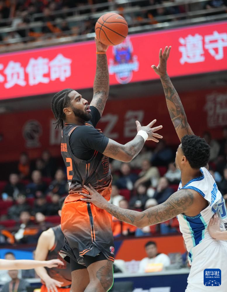 3月14日,山东高速队球员克里斯(左)在比赛中投篮。