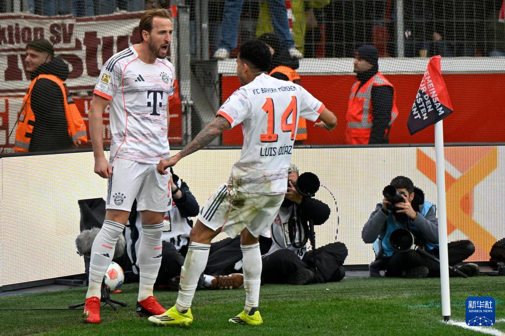 3月14日,拜仁慕尼黑队球员迪亚斯(右)和队友凯恩庆祝进球。