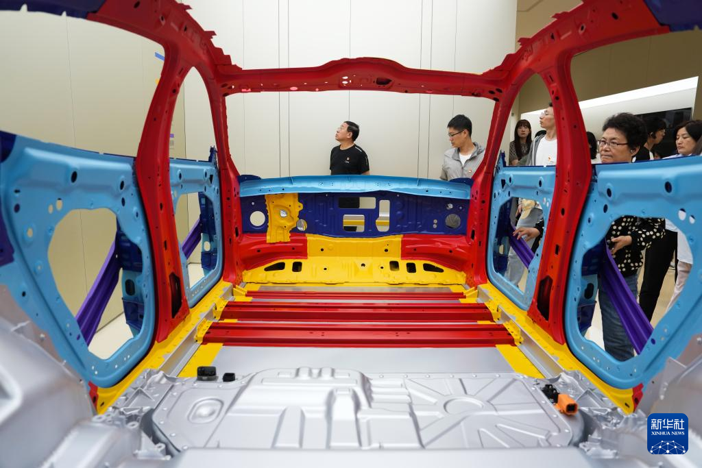 6月16日,参观者在北京小米汽车工厂的科技展厅了解小米汽车铠甲笼式钢铝混合车身。