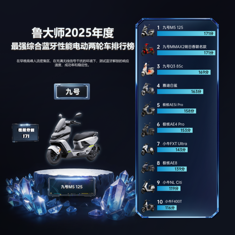 也正因其在智能互联层面的体系化优势,九号M5 125同时摘得“2025年度最强综合蓝牙性能电动两轮车”。其秒级连接、靠近自动唤醒与复杂信号环境下的稳定表现,让“一触即通”成为用户可感知的确定性体验。