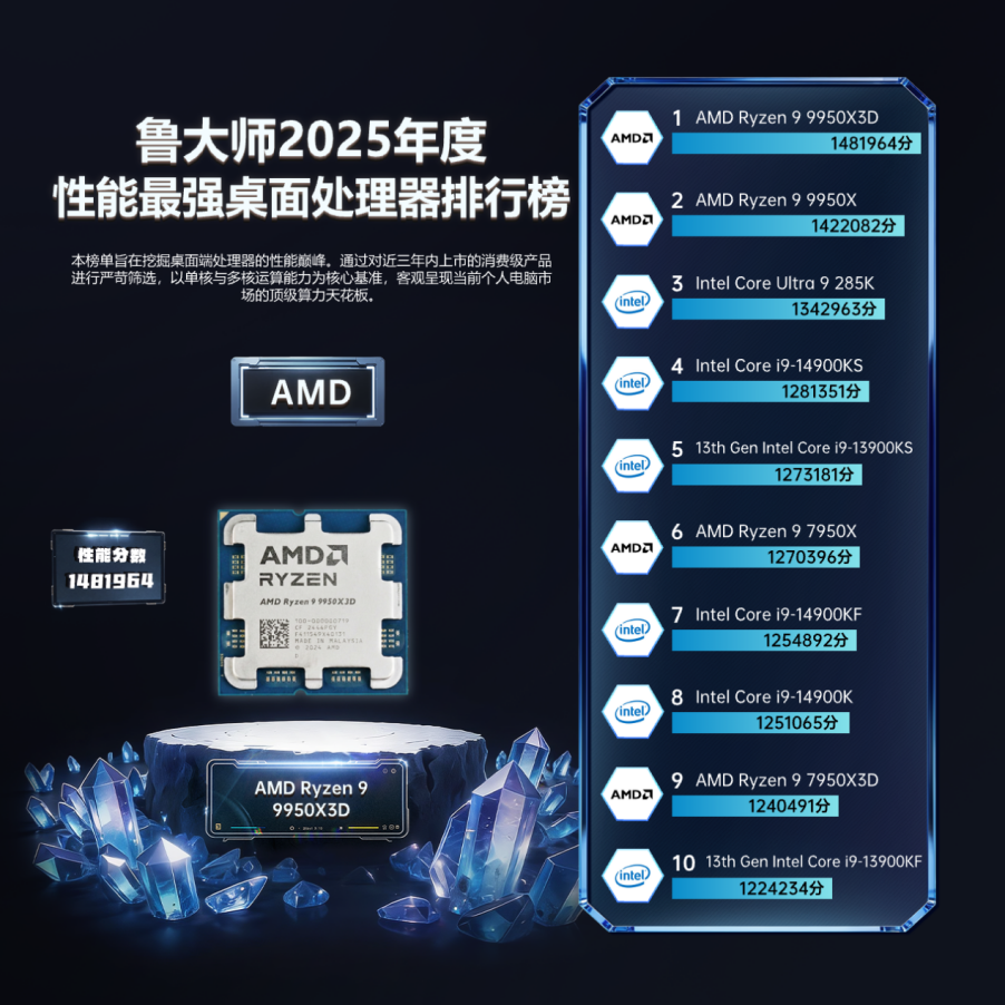 AMD Ryzen 9 9950X3D荣获“2025年度性能最强桌面处理器”。依托第二代 3D V-Cache 技术带来的144MB超大缓存,其在高帧电竞与专业生产力双赛道同时拉满上限:游戏端轻松突破千帧,创作端则以更稳定的吞吐能力建立优势,代表了桌面平台性能最新高度。