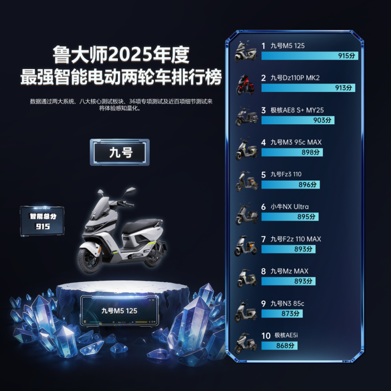 九号 M5 125获评“2025年度最强智能电动两轮车”。从多模态解锁到车辆状态可视化,再到全链路互联体验,九号让两轮车从交通工具进化为数字生活的移动节点,最终以915分智能总分领跑榜单,成为年度智能两轮出行的标杆产品。