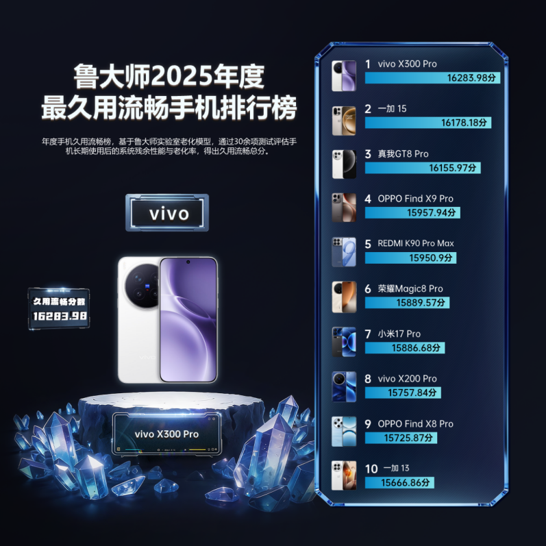 vivo X300 Pro荣获“2025年度最久用流畅手机”。依托天玑9500与自研蓝河流畅引擎,它在超核计算与光子存储能力加持下,以16283.98的高分验证长期使用依旧响应迅捷,体现了“耐久流畅”从口号到能力的落地。