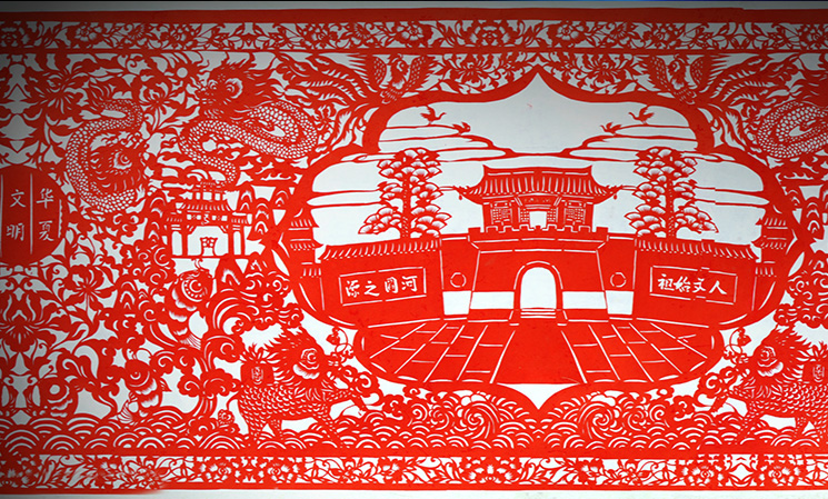 于是我決定回家專門剪紙,但是我父母認(rèn)為鉸花都是老婆婆們閑著沒事做的事,你一個男孩子還是應(yīng)該好好賺錢。就這樣我跟父母僵持了很久,但最后還是我拗著性子從外邊回到了我們農(nóng)村老家,開始尋找會剪紙的老人,去記錄、去詢問、學(xué)習(xí)我們地區(qū)傳統(tǒng)的剪紙民俗知識。因?yàn)楝F(xiàn)在像剪紙這個藝術(shù),在我們的地區(qū)還僅是一些老人出自一些喜好去剪、去做,但隨著這些老人的去世,這些作品也就會隨著一把火被燒掉。我希望我能把這些東西都保留下來,我希望有更多的人去了解我們地區(qū)的剪紙文化,所以我就下決心收集這些剪紙的資料,去申報非物質(zhì)文化遺產(chǎn)名錄。想要申報還要去做很多的事情,一是去尋找這些傳世的老作品,另外就是要擴(kuò)大孟津剪紙的影響力,參加各種比賽去獲獎。那時我白天去尋找老藝人,晚上就自己在屋里埋頭創(chuàng)作,每天晚上都會剪到凌晨一點(diǎn)多。我媽本來是反對的,但是當(dāng)她看到每晚我都會剪到很晚,她就明白了我是真心喜歡這個事兒,就慢慢地開始心疼我。后來她也幫助我開始粘貼,像我剪的《都說我孟津好風(fēng)光》,這個作品長13米,沒有那么長的紙,我們就一起粘貼。花了三個多月剪完,家里邊沒有那么大粘貼裝裱的空間,我父母就站在我們家院子的平房頂上一起把它鋪開,一個一個地粘起來裱好。