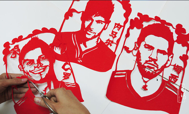 我之前剪過的民俗剪紙作品,像《白蛇傳》、《七月七鵲橋會》、《夜哭郎》等等,這些題材承載的是我們的傳統(tǒng)。但這些較為傳統(tǒng)的剪紙受眾并不多,所以我認(rèn)為青年人要有新的創(chuàng)新,加入現(xiàn)代社會中許多時尚前衛(wèi)的元素,這樣才能獲得更多人的喜愛。在2014年世界杯的時候,我就試著剪“世界杯剪紙”,梅西、C羅、內(nèi)馬爾,讓一些球星躍然紙上,讓熱愛足球的年輕人去關(guān)注、了解到傳統(tǒng)的剪紙藝術(shù)。2015年是世界反法西斯戰(zhàn)爭勝利70周年,我看到關(guān)于戰(zhàn)爭的一些資料圖片后,就創(chuàng)作了一幅《南京大屠殺》剪紙。畫面中運(yùn)用了黃色、紅色、黑色表現(xiàn)土地、火焰還有憤怒,這些都是用剪紙來表達(dá)我心中的感受。我的工作室現(xiàn)在也會做一些時尚的婚紗照剪紙,還有生日剪紙等,把這些傳統(tǒng)吉祥的寓意融入到現(xiàn)代人們的需求、裝飾和禮物中。