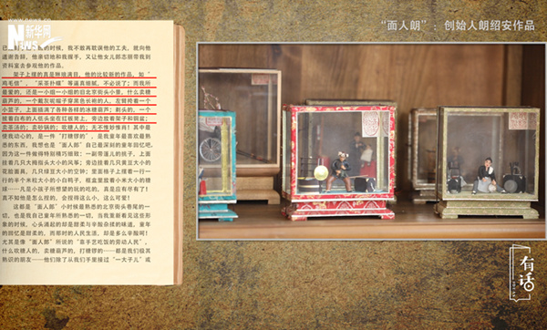 冰心先生的《小桔燈》散文集中,有一篇叫作《“面人郎”訪問記》的文章:“架子上擺的真是琳瑯滿目,他的比較新的作品,如“雞毛信”,“采茶撲蝶”等逼真細膩,不必說了;而我所最愛的,還是一小組一小組的舊北京街頭小景,什么賣糖葫蘆的,一個戴灰呢帽子穿黑色長袍的人,左臂挎著一個小籃子,上面插滿了各種各樣的冰糖葫蘆;剃頭的,一個披著白布的人低頭坐在紅板凳上,旁邊放著架子和銅盆;賣茶湯的;賣砂鍋的;吹糖人的;無不惟妙惟肖!”在文章當(dāng)中,冰心先生也提到了,最令她心動的是一個打糖鑼的,這是她童年最喜歡、最熟悉的東西,她認為這也是“面人郎”最深刻的童年回憶。