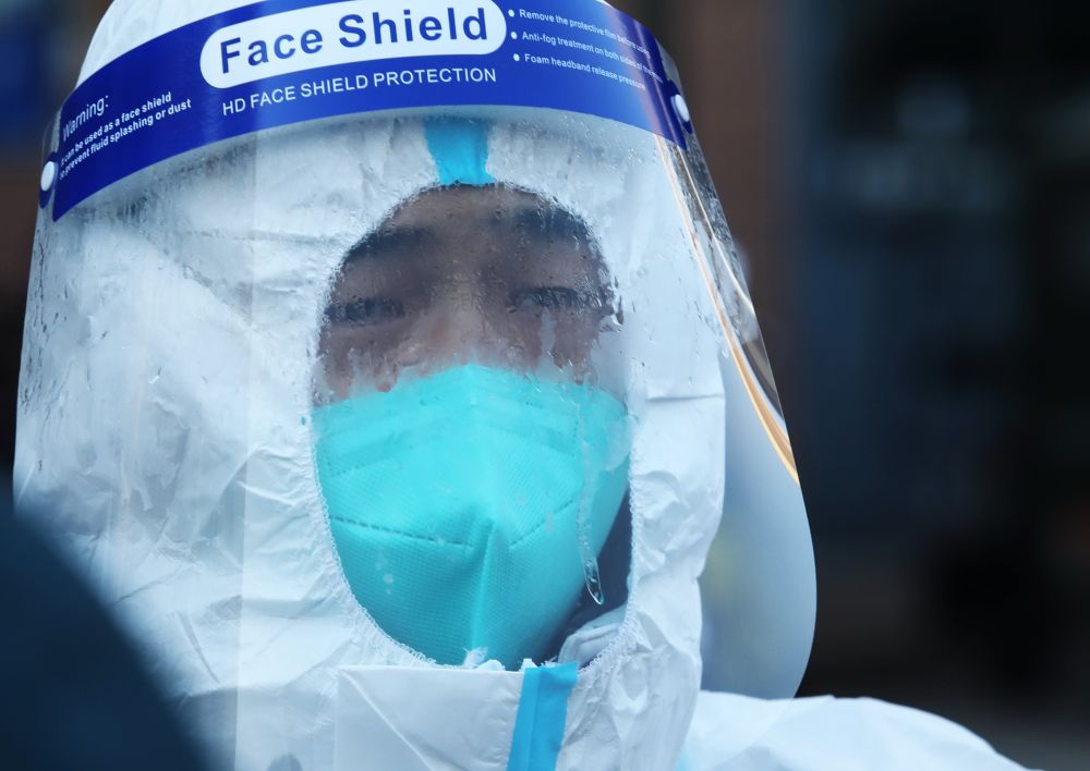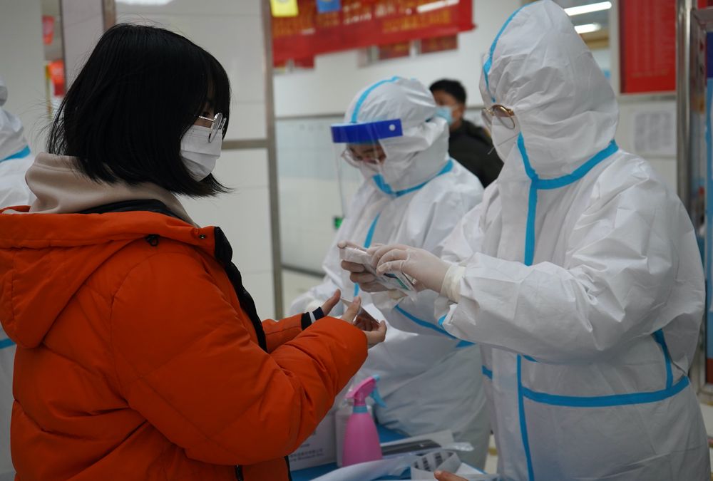 ↑1月7日,在石家莊市裕華區(qū)九里庭院社區(qū),醫(yī)務人員開展核酸檢測前相互加油鼓氣。