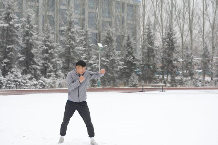 天微亮,田徑場(chǎng)上已鋪滿積雪。跑道中央站著一名身著灰色運(yùn)動(dòng)服的小伙兒,只見(jiàn)他向空氣中揮出一拳又一拳,地上也留下了一圈圈腳印……