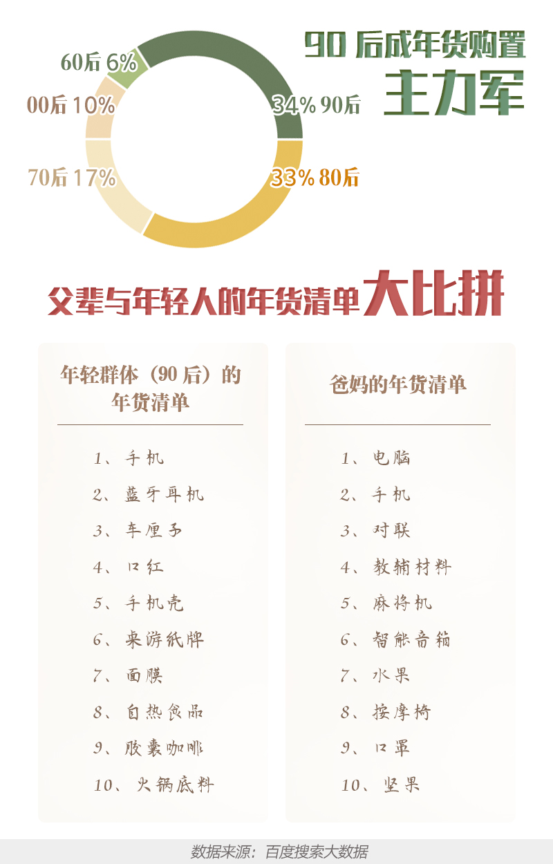 ??? “就地過年”的呼吁下,一二線城市上班的年輕群體受到影響。百度搜索大數(shù)據(jù)顯示,今年關(guān)注年貨購置的群體年齡出現(xiàn)下降。近30天,90后分別占關(guān)注“年貨節(jié)”用戶的34%,成為年貨節(jié)采購的主力軍。