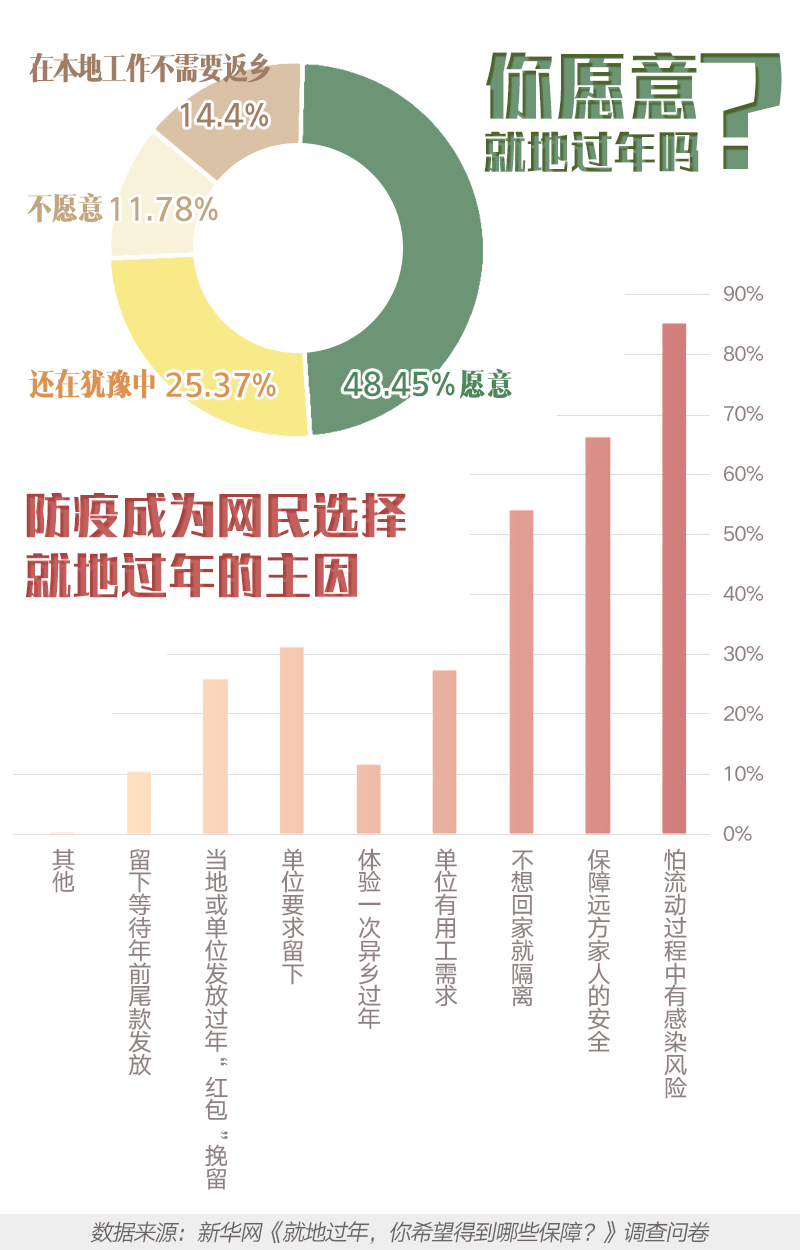 ??? “怕流動過程中有感染風(fēng)險(xiǎn)”是受訪者選擇就地過年的主要原因,占比為85.11%?!氨U线h(yuǎn)方家人的安全(66.28%)”“不想回家就隔離(54.17%)”排在第二、第三位。安心就地過年,是每位留下的人對疫情防控的貢獻(xiàn)。