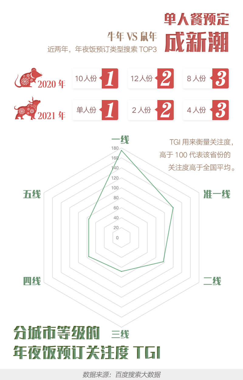 ??? 年夜飯的另外一個(gè)新變化是:許多城市上班族調(diào)整了自己的過年返鄉(xiāng)計(jì)劃,單人份年夜飯?jiān)谝痪€城市受寵?!栋俣?021年貨搜索大數(shù)據(jù)》顯示,相比去年鼠年8-12人居多的年夜飯預(yù)訂類型,今年以4人份、2人份甚至單人份居多。