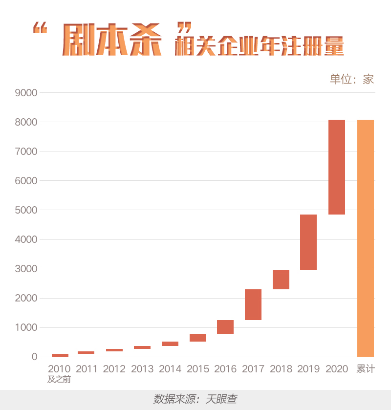 ??? 據(jù)天眼查大數(shù)據(jù)顯示,從事劇本殺相關(guān)企業(yè)近年來的發(fā)展表現(xiàn)迅猛,有超過6,500家。2020年共新增劇本殺相關(guān)企業(yè)超過3,100家,較2019年同比增長63%。目前知名的線上劇本殺平臺、劇本殺游戲社交平臺有我是謎、天天劇本殺、推理大師、百變大偵探、天天狼人殺等。
