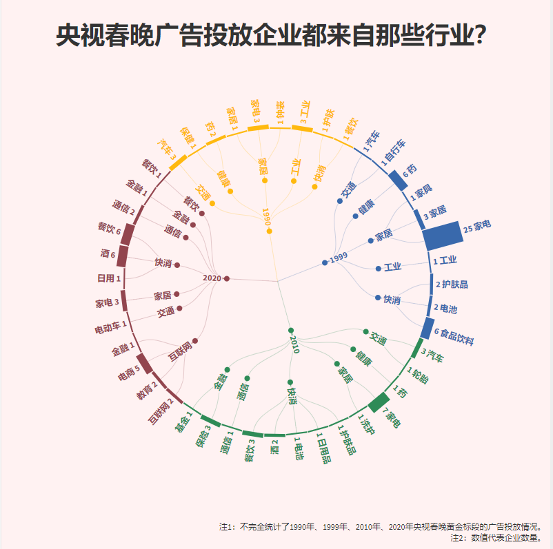 有人把春晚稱作“中國經(jīng)濟的晴雨表”,認為它一定程度上反映了中國經(jīng)濟的發(fā)展。如果細數(shù)贊助商廣告企業(yè)所屬的行業(yè),可以一窺其變化路徑。