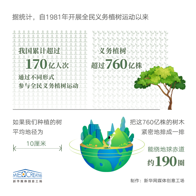 1981年,第五屆全國人民代表大會第四次會議通過《關于開展全民義務植樹運動的決議》。至此,植樹造林、綠化祖國成為中國每一位適齡公民的法定義務,一代代中華兒女熱情參與到綠化祖國的浪潮中,義務植樹運動從此在神州大地蓬勃開展起來。每到植樹時節(jié),從城市到鄉(xiāng)村、從機關到工廠、從部隊到學校、從內(nèi)地到邊疆,全國各族人民揮鍬揚鋤,造林綠化的浪潮一浪高過一浪。