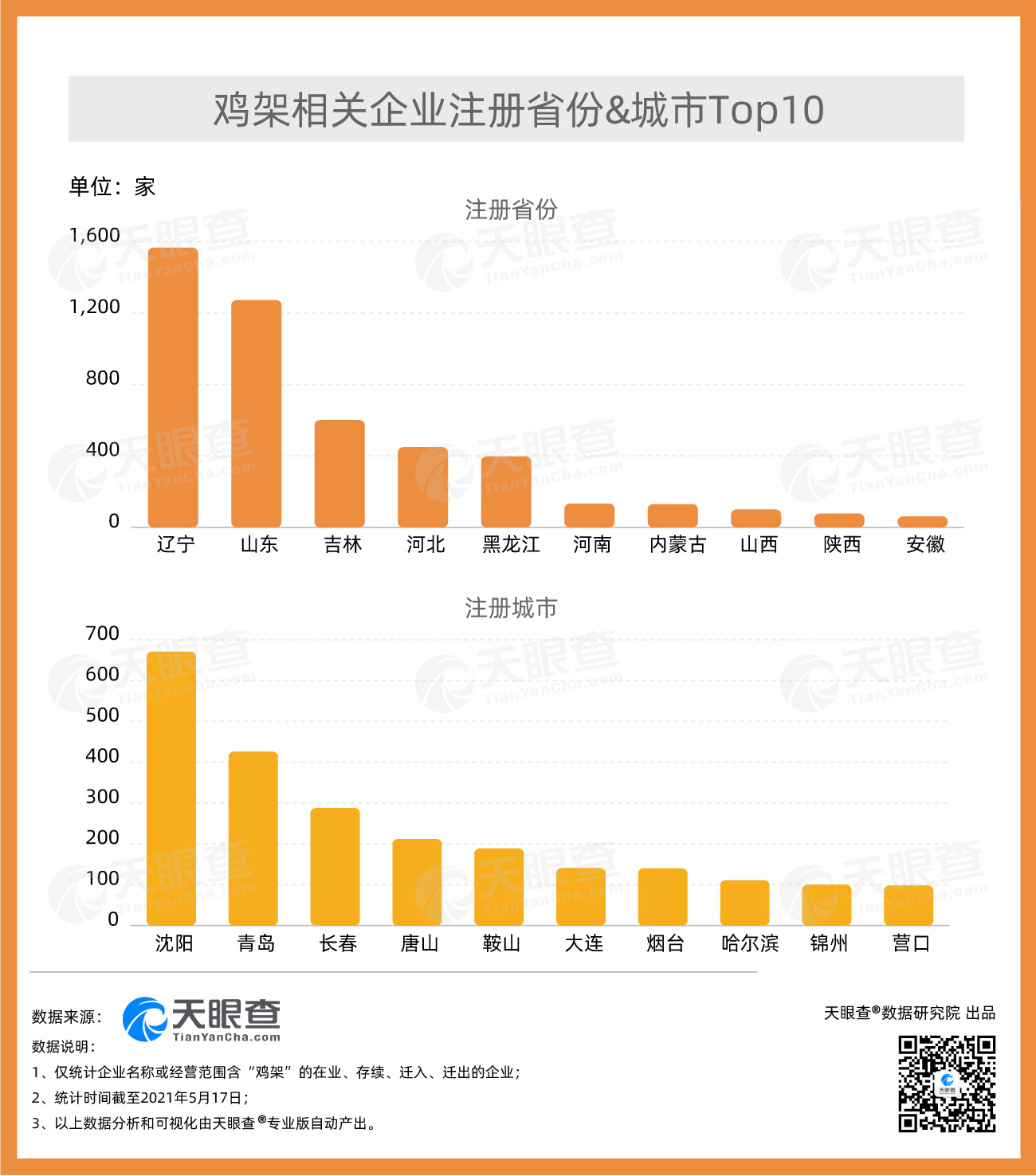 ????? 從地域分布上看,遼寧的雞架相關(guān)企業(yè)數(shù)量最多,有近1,600家,占全國近3成。其次為山東,有1,200余家雞架相關(guān)企業(yè)。分城市來看,沈陽以670余家雞架相關(guān)企業(yè)位居全國首位,其次為青島,有400余家相關(guān)企業(yè)。天眼查數(shù)據(jù)顯示,近年來我國雞架相關(guān)企業(yè)年注冊量整體呈現(xiàn)上漲趨勢。2019年,我國新增2,200余家雞架相關(guān)企業(yè),年注冊量達到歷史最高。2020年,我國新增近2,000家雞架相關(guān)企業(yè)。