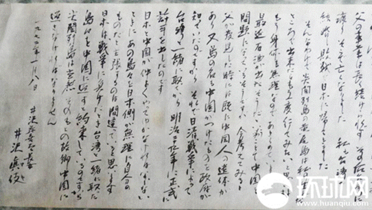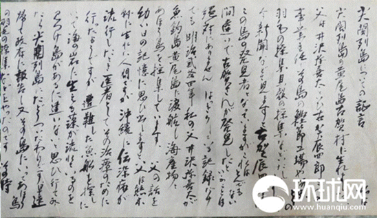 ????伊澤彌喜太長(zhǎng)女伊澤真伎1901年2月生于黃尾嶼。她于1972年1月8日口述并請(qǐng)人代筆,用毛筆寫下一份《關(guān)于尖閣列島的證言》,其中披露了其父伊澤彌喜太1891年首次登島開發(fā)一事,并明確指出釣魚島“應(yīng)該歸還給它的故鄉(xiāng)——中國(guó)”。筆者現(xiàn)將部分證言的譯文公諸于眾:“我出生于尖閣列島(譯者注:釣魚島列島)的黃尾島古賀村。父親是井澤彌喜太(注:經(jīng)核實(shí)應(yīng)為伊澤彌喜太,屬于同音字記錄筆誤)。他曾任古賀辰四郎的業(yè)務(wù)主任,在該島經(jīng)營(yíng)干制鰹魚工廠,也采集信天翁的羽毛以及貝殼等?,F(xiàn)在報(bào)紙等報(bào)道稱古賀辰四郎是第一個(gè)發(fā)現(xiàn)該島嶼的人,這是彌天大謊,是絕對(duì)不可能的事情。因?yàn)橛忻魑挠涗浛梢宰C明,我父親于明治二十四年(1891年)航行至魚釣島(即釣魚島)、黃尾島,打撈海產(chǎn)品和采集信天翁的羽毛?!赣H登島后曾對(duì)其進(jìn)行調(diào)查,期間在一個(gè)洞穴里發(fā)現(xiàn)兩具身著中國(guó)服裝的骸骨?,F(xiàn)在看來,在父親登島之前可能已有中國(guó)人達(dá)到此處。父親和古賀相識(shí)是因?yàn)楣刨R當(dāng)時(shí)很有錢,他曾主動(dòng)向父親提出:‘你在沖繩經(jīng)營(yíng)事業(yè)需要資金,我們一起合作怎么樣。’因?yàn)槭枪刨R出資,所以名義上是古賀經(jīng)營(yíng),但一切事務(wù)實(shí)際上都是由我父親全權(quán)負(fù)責(zé)的。古賀也曾說過,他允許我父親在那里自主隨意地經(jīng)營(yíng)。