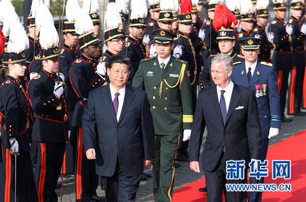 ????3月30日,中國國家主席習近平在布魯塞爾會見比利時國王菲利普。會見前,習近平出席菲利普國王在王宮廣場舉行的隆重歡迎儀式。新華社記者 鞠鵬 攝