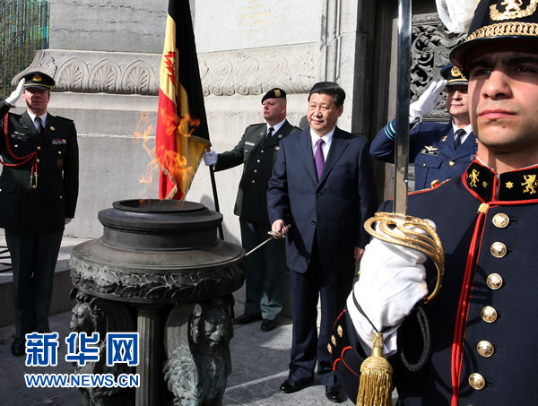 3月30日,中國國家主席習近平在布魯塞爾向比利時無名戰(zhàn)士墓獻花圈。 新華社記者 龐興雷 攝