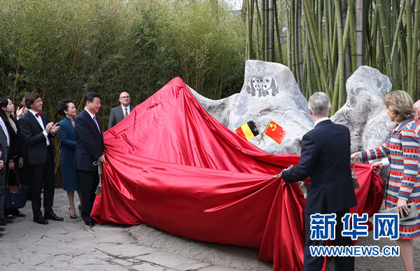 ????3月30日,國(guó)家主席習(xí)近平和比利時(shí)國(guó)王菲利普共同出席比利時(shí)天堂公園大熊貓園開園儀式。這是習(xí)近平和夫人彭麗媛同菲利普國(guó)王夫婦共同為大熊貓園揭幕。 新華社記者 龐興雷 攝