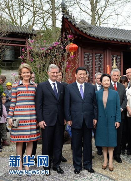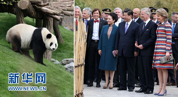 ????習(xí)近平和夫人彭麗媛抵達(dá)時(shí),受到菲利普國(guó)王和瑪?shù)贍柕峦鹾?、比利時(shí)首相迪呂波熱情迎接。兩國(guó)領(lǐng)導(dǎo)人一同步入中國(guó)園。亭臺(tái)樓閣、雕梁畫棟、鳥語(yǔ)花香,這里宛如一幅恬靜祥和的中華寫意畫。兩國(guó)元首夫婦沿著回廊曲徑,穿過(guò)青翠竹林,前往大熊貓園。他們邊走邊談,回顧中比兩國(guó)友好交往。