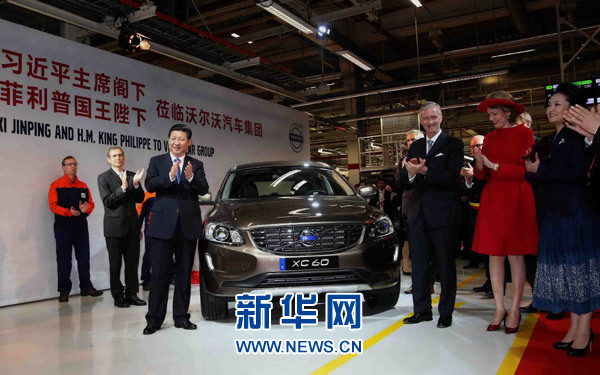 ????4月1日,國家主席習(xí)近平在比利時(shí)國王菲利普陪同下參觀沃爾沃汽車公司根特工廠。這這是習(xí)近平和菲利普國王共同為公司出口中國的第30萬輛汽車揭幕。 新華社記者 姚大偉 攝