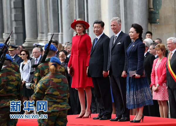 當?shù)貢r間1日下午,習(xí)近平離開比利時布魯日市啟程回國。離開前,比利時國王菲利普在布魯日廣場為習(xí)近平舉行隆重歡送儀式。習(xí)近平和夫人彭麗媛,菲利普國王和瑪?shù)贍柕峦鹾笠煌饺霃V場。習(xí)近平在菲利普國王陪同下檢閱儀仗隊。軍樂隊奏中比兩國國歌,兩國元首共同檢閱儀仗隊分列式。
