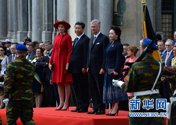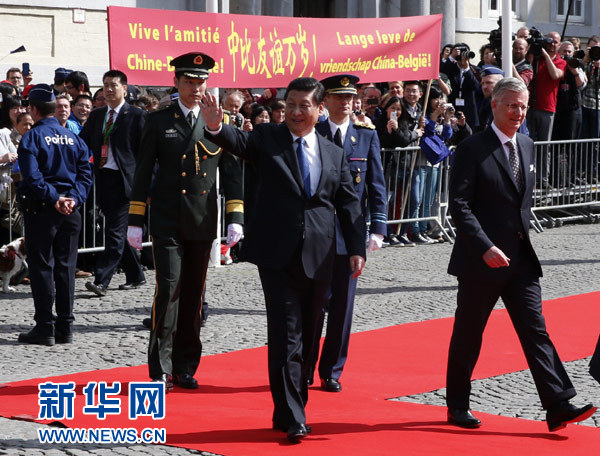 ??? 4月1日,國(guó)家主席習(xí)近平離開(kāi)比利時(shí)布魯日市啟程回國(guó)。離開(kāi)前,比利時(shí)國(guó)王菲利普在布魯日廣場(chǎng)為習(xí)近平舉行隆重歡送儀式。 新華社記者馬占成攝