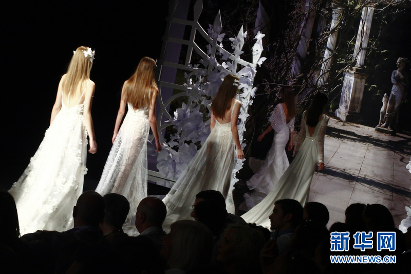模特在T臺(tái)上展示西班牙品牌Yolan Cris的婚紗。Yolan Cris品牌由Yolanda和Cristina姐妹聯(lián)手打造,同時(shí)這也是來自巴塞羅那當(dāng)?shù)氐囊粋€(gè)婚紗品牌。