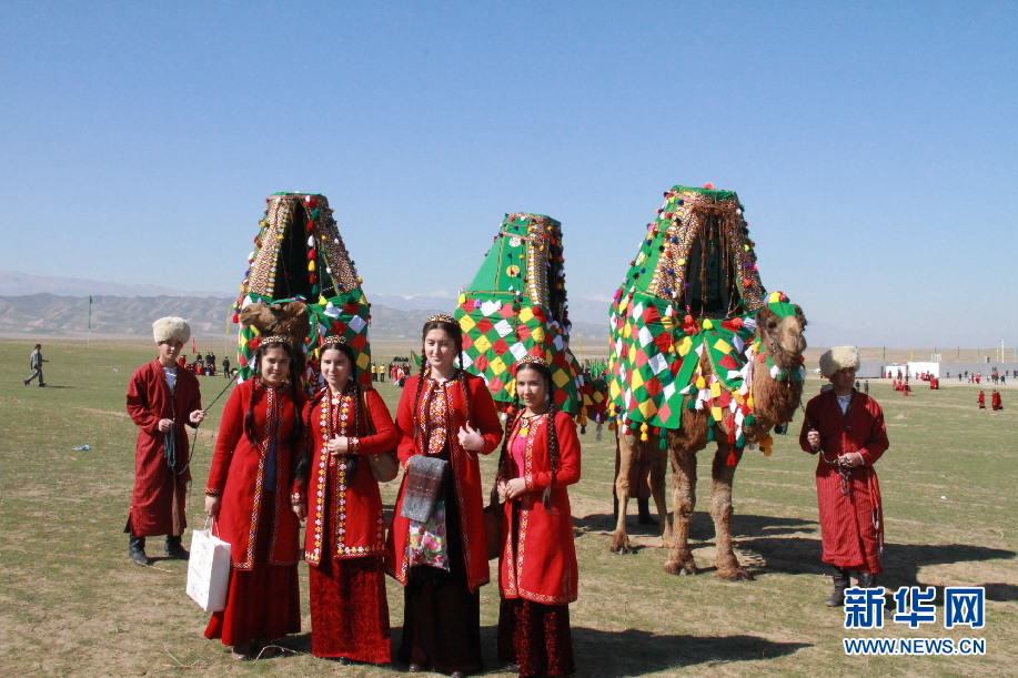 ????記者還看到過20來頭駱駝組成的駝群,其中頭駱身上綁著個布袋。駱駝低頭吃草,頭駝警覺地給它們站崗放哨。不一會兒,一些駱駝走到頭駝身前,向它施貼臉禮,頭駝一一回禮。當(dāng)記者試圖靠近時,頭駝發(fā)出低沉的怪聲,群駝迅速抬起頭來,慢慢地朝遠(yuǎn)方走去。在過節(jié)時,牧民小伙穿上紅色條狀長袍,頭戴白色羊羔皮帽,手牽的駱駝身上裹著人工織的毛毯,背上架著花轎,花轎中坐著美麗少女,少女頭戴小帽,梳著兩根長辮,身穿蓋過腳面的長裙。這是在給節(jié)日助興。同時,這也是土庫曼斯坦民族婚禮中迎娶新娘的一個縮影。在現(xiàn)實生活中,城市人很少見到駱駝。于是在各種活動中,跟打扮得如此漂亮的駱駝合影也是一件趣事。