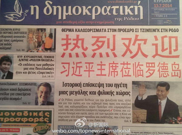 ????新華網(wǎng)北京7月14日電 據(jù)新華社“新國際”微博報(bào)道,希臘羅德島報(bào)紙《民主報(bào)》13日在頭版發(fā)表題為《一個偉大友好國家領(lǐng)導(dǎo)人的歷史性訪問》文章,并用中文紅色大字體寫著“熱烈歡迎習(xí)近平主席蒞臨羅德島”。文章說,熱情好客的羅德島人民祝愿習(xí)近平主席身體健康,祝愿中國在習(xí)主席領(lǐng)導(dǎo)下取得跨越式發(fā)展,祝愿中國繁榮昌盛。