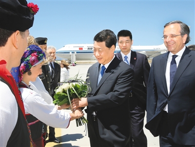 習(xí)近平抵達(dá)羅德島迪亞哥拉斯機(jī)場時(shí),希臘總理薩馬拉斯專程從首都雅典前來,并率多名內(nèi)閣部長和羅德市市長到機(jī)場歡迎。習(xí)近平在舷梯旁同薩馬拉斯握手,互致問候。身著當(dāng)?shù)貍鹘y(tǒng)服裝的希臘青年向習(xí)近平獻(xiàn)花。希臘禮兵沿紅地毯兩側(cè)列隊(duì),向習(xí)近平行注目禮。