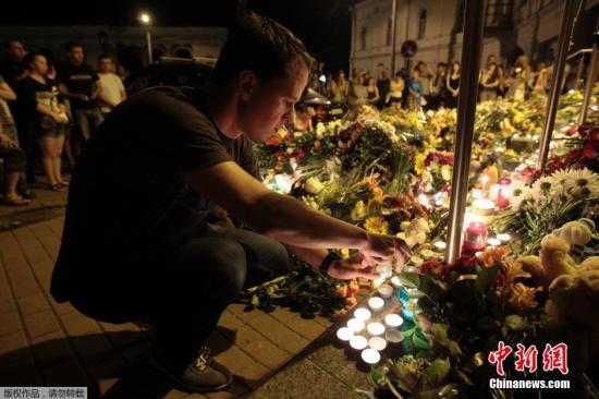 資料圖:7月17日,烏克蘭基輔,民眾們手持鮮花和蠟燭在荷蘭駐烏大使館前悼念馬航MH17事故遇難者。據(jù)稱,該架飛機上所載人數(shù)為298人,而此前報道稱飛機上共載295人。由于此次事件可能導(dǎo)致地面人員傷亡,總共的遇難人數(shù)將超過300人。