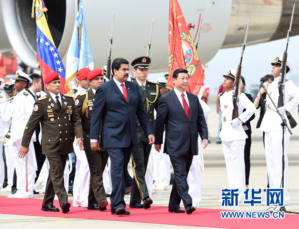 ????馬杜羅在機(jī)場(chǎng)為習(xí)近平舉行隆重歡迎儀式。兩國(guó)元首登上檢閱臺(tái)。軍樂團(tuán)奏委中兩國(guó)國(guó)歌,升中國(guó)國(guó)旗。習(xí)近平在馬杜羅陪同下檢閱儀仗隊(duì)。