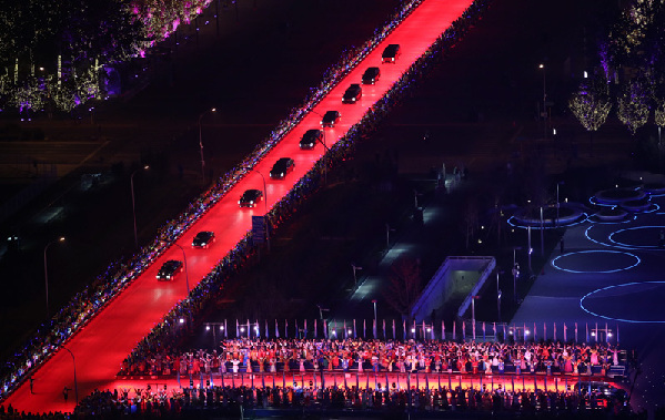 18時(shí)許,貴賓的車隊(duì)依次駛過鐳射燈照射鋪就的紅地毯,被迎領(lǐng)到水立方。歡迎人群載歌載舞,氣氛熱烈友好。