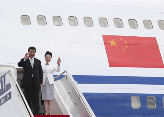 ??? 11月21日,國家主席習(xí)近平抵達(dá)楠迪。圖為習(xí)近平和夫人彭麗媛步出機(jī)艙。(攝影 丁林)