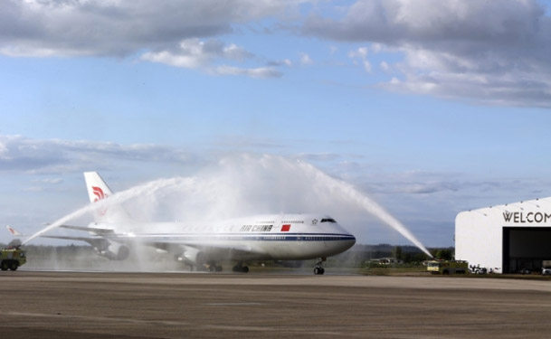????11月21日,習(xí)近平乘坐的專機(jī)在楠迪國際機(jī)場跑道上滑行穿過“水門”,這是當(dāng)?shù)亟o予最尊貴客人的禮遇,表達(dá)為客人“洗塵”。 (攝影 丁林)