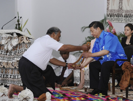 ????習(xí)主席在開場白中,首先就提到了東道主對中國代表團(tuán)的熱情接待和周到安排:“昨天下飛機(jī),歡迎儀式很隆重。接著,又安排了具有斐濟(jì)民族特色的歡迎儀式和盛大的歡迎晚宴。我再一次對總理先生和斐濟(jì)政府表示感謝?!?/font>