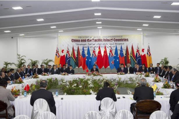 ????會議廳寬敞明亮,背景布上醒目地用中英文寫著“中國—太平洋島國:相互尊重、共同發(fā)展的戰(zhàn)略伙伴關(guān)系”。這一伙伴關(guān)系的確立,是習(xí)主席和8位島國領(lǐng)導(dǎo)人一致同意的重要成果。背景布前面擺著中國和8個太平洋島國的國旗,很是好看。整個會議廳,被布置得喜氣洋洋。